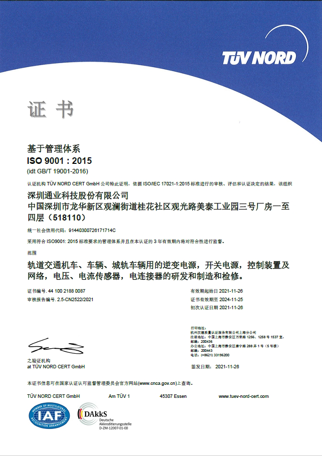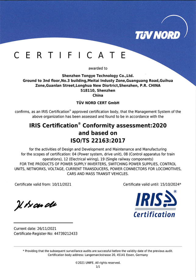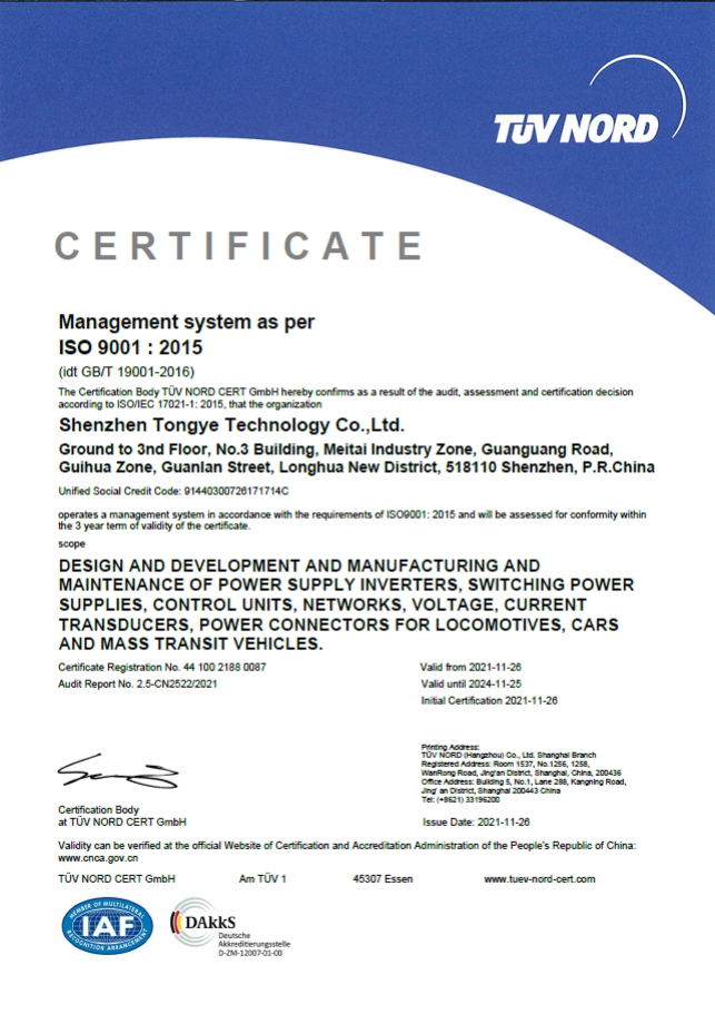Established in 2000, Shenzhen Tongye Technology Co., Ltd. (hereinafter referred to as the "Tongye"), is a national high-tech enterprise specializing in the R&D, manufacture, sales and maintenance services of rail transit electrical equipment products. Tongye officially became a listed company in Shenzhen Stock Market Exchange in 2021 (stock code: 300960). Headquartered in Shenzhen, Tongye has wholly owned subsidiaries in Guangzhou, Shijiazhuang, Chengdu, Wuhan, Changchun and its sales and maintenance service stations network cover the whole country.